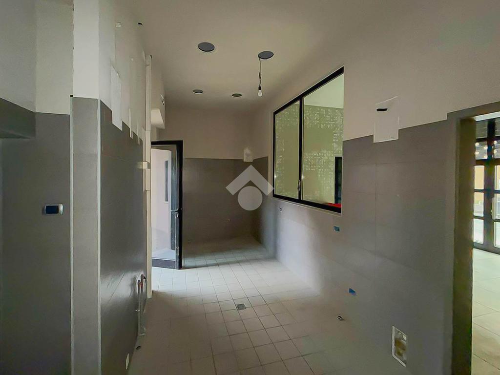 L'ufficio è dotato di predisposizione per gli impianti elettrico, di illuminazione e di riscaldamento, oltre alla presenza della canna fumaria. Completano la proprietà tre servizi igienici a norma disabili e un’area esterna esclusiva di circa 65metri quadrati, situata sul retro dell’immobile.